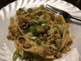 Die Tagliatelle in die Pfanne geben und alles gut vermischen. Auf Tellern anrichten und mit den vorbereiteten Frühlingszwiebeln und Walnusskernen garnieren.