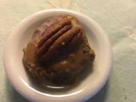 Für die Glasur Kaffepulver mit heißem Wasser anrühren und mit dem Puderzucker zu einer dickflüssigen Masse verrühren. Die Masse auf die Kekse geben, mit je einer Pekannuss belegen und die fertigen Taler auf einem Gitter 2 Stunden trocknen lassen.