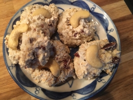 Mit Hilfe zweier Teelöffel kleine Häufchen (etwa 12 g) der Masse auf ein mit Backpapier ausgelegtes Backblech setzen. Je einen Cashewkern daraufgeben und leicht andrücken.