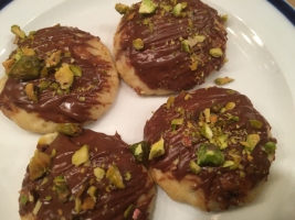 Kuvertüre und restlichen Nougat vermischen und im heißen Wasserbad schmelzen. Die Laibchen damit bestreichen und mit gehackten Pistazien bestreuen.
