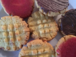 Die Kekse auf einem Kuchengitter auskühlen lassen. Kuvertüre im Wasserbad schmelzen, Himbeersaft und Puderzucker zu einer Glasur verrühren. Die Rückseite der Kekse entweder mit Kuvertüre oder Himbeerglasur bestreichen. Trocknen lassen und in einer Keksdose aufbewahren.
