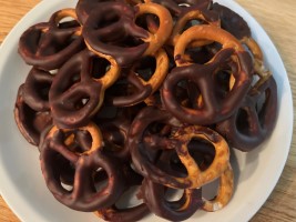 Die Schokolade schmelzen. Eventuell etwas Milch zugeben, wenn die Masse zu dickflüssig ist. Die Salzbrezeln mit der Schokolade überziehen und auf Backpapier trocknen lassen.
