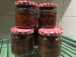 Die Gläser leicht einölen und mit jeweils 100 g Teig bis zur Hälfte füllen. Die Gläser gut abwischen und im auf 180°C vorgeheizten Backofen 30 Minuten backen. Soll alles gleich gelöffelt werden, dann die Gläser im ausgeschalteten Ofen bei leicht geöffneter Türe etwas auskühlen lassen.