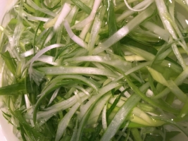 Die Lauchzwiebeln in dünne Längsstreifen schneiden und 10 Minuten im Wasserbad wässern.