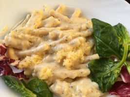 Die Maccaronelli in reichlich kochendem Salzwasser ca. 4 Minuten vorgaren und abgießen.