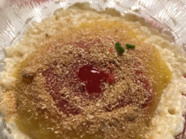 Den Milchreis in Dessertschalen füllen und mit dem Mangomus und Kokoszucker bestreut servieren. Etwas Schnittlauchgrün ist zwar geschmacklich nicht notwendig, dient aber der Optik.