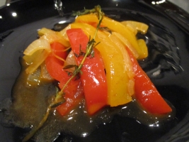 Die Paprikaschoten vierteln, entkernen und in Streifen schneiden. Die Zwiebeln in ebenfalls in Streifen schneiden, den Knoblauch in Scheiben.