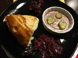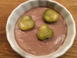 Für die Soße, die Cranberries abgießen und zusammen mit dem Zucker und Wasser aufkochen und 10 Minuten köcheln lassen. Die Pastete mit ein paar Scheiben Essiggurken und einem Klecks noch warmer Cranberry-Soße servieren