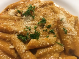 Die Nudeln nach Packungsanweisung kochen, abgießen und im noch warmen Topf mit der Paprikasoße gut vermengen.