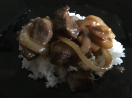 Das Butterschmalz im Wok rauchig heiß werden lassen. Das Fleisch gegebenenfalls portionsweise und ohne Rühren auf einer Seite 2 Minuten anbraten. Dabei sollten sich die Ränder leicht bräunen. Nun das Fleisch wenden und gemeinsam mit den auf 7 mm Dicke geschnittenen Zwiebelringen, dem geschälten und in dünne Scheiben geschnittenen Ingwer, reichlich frisch gemahlenem schwarzen Pfeffer und Wasser im Wok vermischen. Unter häufigem Rühren 2 Minuten kochen bis Zwiebeln und Ingwer weich sind.