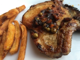Zu den Koteletts passen beispielsweise Pommes frites.