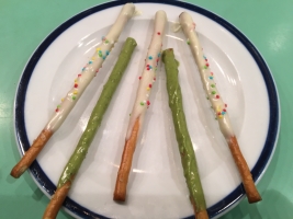 Die Schokolade zerkleinern und schmelzen. Zur Hälfte der Schokolade den Matcha unterrühren. Die Salzstangen mit der Schokolade überziehen, mit Zuckerstreusel bestreuen und auf einem mit Backpapier ausgelegten Backblech fest werden lassen.
