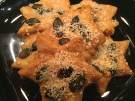 Den Teig nochmals durchkneten, dünn ausrollen und Sterne ausstechen. Die Stelle di parmigiano auf ein mit Backpapier ausgelegtes Blech geben. Eigelb und Wasser verquirlen und die Teiglinge damit bestreichen. Kürbiskerne, Sesamsaat und restlichen Parmesan darauf verteilen.