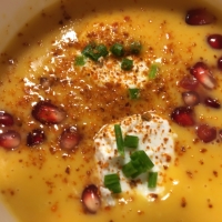 Vor dem Servieren die abgetropften Kichererbsen unterrühren und die Suppe erwärmen aber nicht kochen. Die Suppe in Schalen anrichten. Den in Scheiben geschnittenen Ziegenkäse daraufgeben und Granatapfelkerne sowie Chiliflocken darüberstreuen.