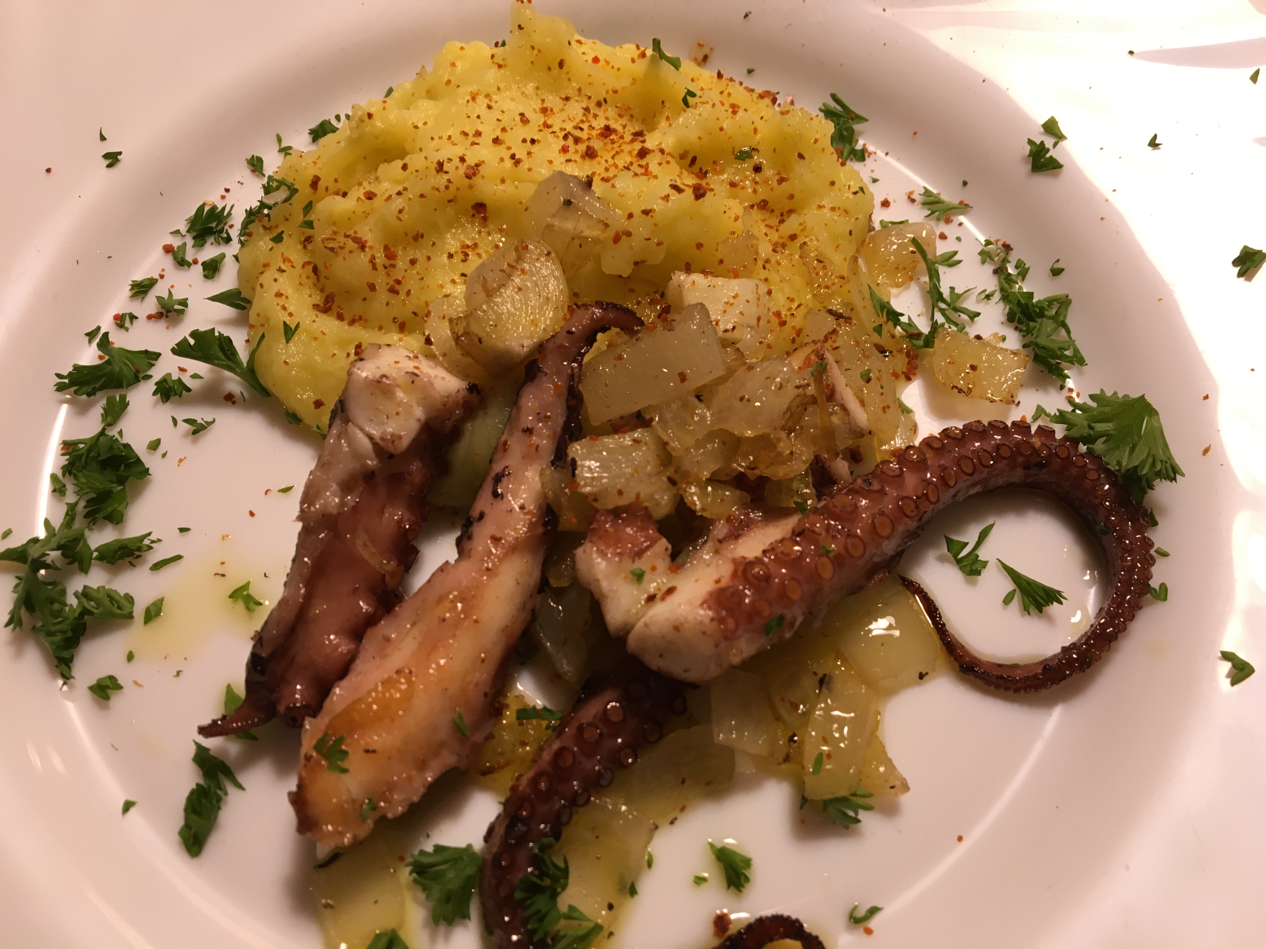 Das Gericht stammt aus Sardinien und wird gerne von Puré di Patate al Limone begleitet. Falls keine physio- oder psychotherapeutischen Indikationen gegeben sind, kann auf das ansonsten notwendige heftige Schlagen des frischen Tintenfischs verzichtet und auf küchenfertige Tiefkühlware zurückgegriffen werden.