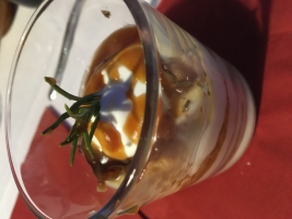 Mascarpone-Creme, Amarettini-Brösel und den Dattel-Mix abwechselnd in Dessertgläser schichten. Danach kühl stellen. Zum Servieren mit Karamellsoße beträufeln und mit etwas Rosmarin dekorieren.