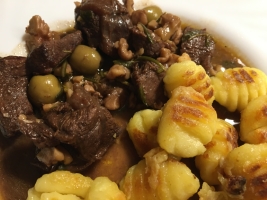 Das Gulasch bei schwacher Hitze 30 Minuten im geschlossenen Topf schmoren. Danach die Oliven dazugeben und weitere 30 Minuten schmoren. Falls nötig, während des Schmorens noch etwas Wildfond angießen.