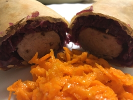 Die Wurst auf das Rotkraut legen, die Ränder einklappen und den Strudel locker einrollen. Den Strudel einölen und mit dem Verschluss nach unten auf Backpapier legen.