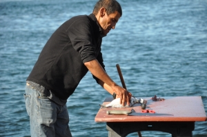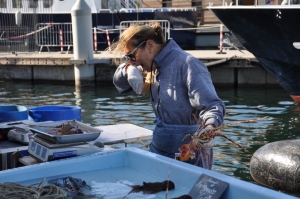 Nach dem Frühstück führte uns der erste Weg zum Fischmarkt am »Quai des Belges«, wo wir das, was es abends im Restaurant zu essen geben wird, in noch lebhafter Rohform bewundern konnten. Auf diesem Markt landen die FischerInnen morgens ihren des Nachts in der Bucht gemachten Fang an und die Fische werden je nach Wunsch der KundInnen gleich vor Ort ausgenommen. Der Arbeitstag der FischerInnen beginnt am Abend, wenn sie mit ihren Booten auslaufen, und endet erst wieder am Nachmittag, wenn alle Verkaufsstände abgebaut und die Promenade blitzsauber gespült ist.