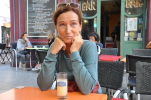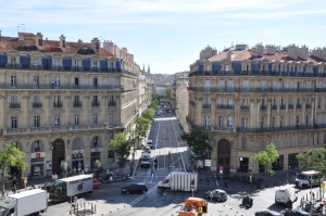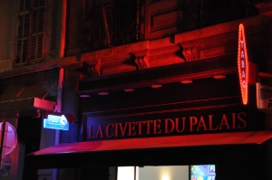 Den heutigen Abend lassen wir im »Cours Julien« ausklingen, einem Viertel, das eigentlich immer zur Hälfte ausgestorben ist: Vor 19:00 sind alle Restaurants mit massiven Rolläden verrammelt, nur die Geschäfte dazwischen haben geöffnet. Danach ist es genau umgekehrt: Die Geschäfte sind geschlossen und mit dicken Türen gesichert, stattdessen finden sich in den engen Gässchen die einladend gedeckten Tische der Restaurants. Da wir fürs Abendessen zu früh angekommen sind, bleibt noch genügend Zeit für Kaffee, ein Eis beim »L'Elephant Rosé à Points Blancs« und ein Bier vom Fass im Freiluftfoyer des Programmkinos. Danach gibt es ein leckeres Abendessen in einer engen und von Mopeds und manchen Autos befahrenen Gasse mit zwei Vorspeisen (Tarte Oignon, Oeuf cocotte mit Entenleber), und drei Hauptgängen (»Lachsfrikadelle« mit Reis, Käsefondue mit Kartoffeln und Schinken, Entenbrust mit Zwiebeln), aber dieses Mal ganz ohne Dessert Dieses Nachtmahl verleitet uns zu einem Spaziergang ins Hotel auf dem die mittlerweile über Marseille untergegangene Sonne mit entsprechendem Neonschein den schon länger untergegangenen Osten grüßt.