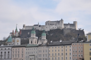 Hoch über den Dächern der Stadt thront die Festung Hohensalzberg, ein Geschenk des österreichischen Staates an das Land Salzburg zum 200. Geburtstag. Der Festungsberg selbst spielte schon zu Beginn unserer Zeitrechnung eine wichtige Rolle, war er doch der einzig sichere Zufluchtsort für die in Salzburg siedelnden Menschen bei den schon damals immer wieder vorkommenden Ein- und Überfällen der Germanen. Wir bleiben daher lieber im Tal und genießen die letzten Sonnenstrahlen des Tages an der Salzach. Martin wird neu eingekleidet und danach durchstreifen wir die engen Gässchen der Altstadt.