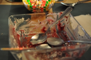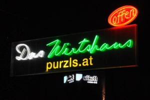 Die beinahe einstündige Verspätung des Railjet von Budapest nach Wien verzögert unser Wiedersehen in Wien. Paul hat seine Klausur überstanden und kam pünktlich in Wien an, wo er geduldig auf seine Reisebegleitung wartete. Der späten Ankunft geschuldet, blieb uns an diesem Abend nichts mehr als ein Besuch in einem Traditionswirtshaus mitten in einem Industriegebiet im 23. Bezirk. Die alte Fertigteilholzhütte hat mehrere Um- und Anbauten hinter sich und beherbergt altes Wirtshausmobiliar, eine alte Theke und einen funktionsfähigen Holzkachelofen, alles aus aufgegebenen Gaststätten in der näheren und weiteren Umgebung Wiens zusammengekauft. Das Essen war sehr lecker und für Wiener Verhältnisse auch einigermaßen preisgünstig: Frittatensuppe und Kuttelflecksuppe als Vorspeise, paniertes Lammschnitzel, panierte Kaninchenteile und Lachsforelle (nicht paniert) als Hauptgang. Das nicht auf der Karte stehende Dessert war ein echtes Highlight: Kastaniencrème in Nudelform auf einem Beerenkompott mit Sahne. Das Dessert war so schnell aufgefuttert, dass uns erst danach einfiel, dass wir eine Kamera dabei haben.