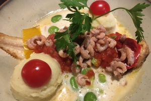 Zum Abendessen hatten wir ausgesprochenes Glück mit dem vierblättrigen Kleeblatt des Restaurants »'t Klaverblad«. Fröhliche, familiäre Atmosphäre mit singender Kellnerin und ein leckeres Drei-Gänge-Menü bestehend aus gebratenen Scampi in Pernot-Sauce, Pollock mit gebackenem Gemüse bzw. einem Schweinefilet in Gentner Tierenteyn-Senf-Sauce und einer Crème brûlée mit Amaretto.